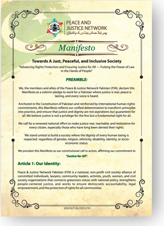 The Peace & Justice Network (PJN) is the largest national civil society network for rights and justice in Pakistan. Formally registered as a national not for profit network under Section 42 with the SECP in 2016, PJN envisions a legally empowered society that upholds the rights of all citizens and rejects all forms of abuse, neglect, and violence. It strives to establish a National Rights and Justice Safety Net for All by promoting professionally informed institutional networking and collaborative programming to enhance the demand for equitable justice — including gender justice, climate justice, and civic justice — and to strengthen human rights protection and access to justice services for all citizens, particularly the poor, disadvantaged, and vulnerable, including transgender persons, women, children, refugees, stateless persons, religious minorities, and persons with disabilities. PJN Pakistan is united in the belief that human rights protection, democratic inclusion, justice for all, and peaceful societies are both the outcomes and enablers of sustainable and equitable development. | PJN Manifesto English and URDU